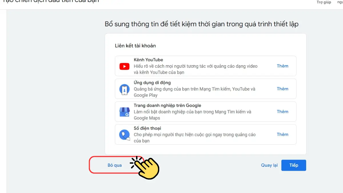 Việc bỏ qua tạo chiến dịch mới sau này chúng ta sẽ tập trung vào tạo, tránh tạo trong quá trình tạo tài khoản khiến người mới Dễ Mắc Lỗi (phần lớn người Kinh nghiệm cũng bỏ qua).